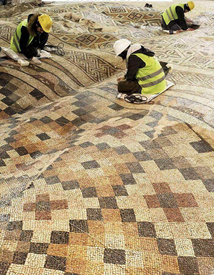 一幅在土耳其被挖掘出來的馬賽克被地震弄皺了。