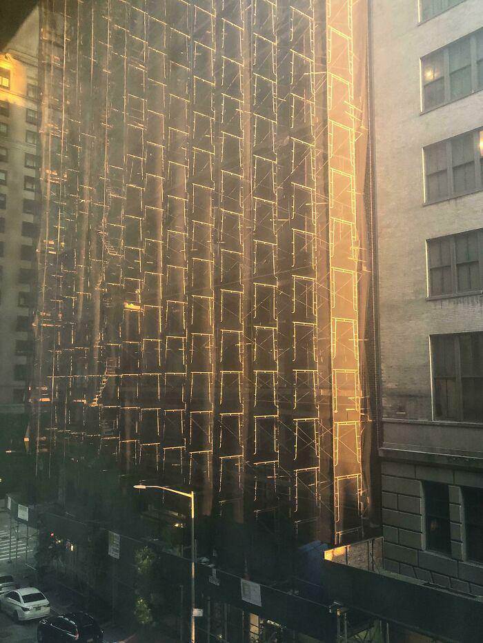夕陽與腳手架交織。