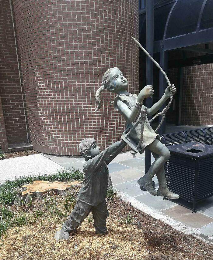 小孩雕塑在秋千上搖曳,仿佛蕩入虛無。
