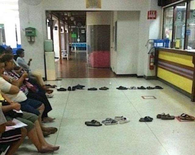 第四張:排隊太久站著累怎麼辦?索性把鞋子放在地上排隊,自己在旁邊玩手機好了。就是希望不要有人有腳氣。
