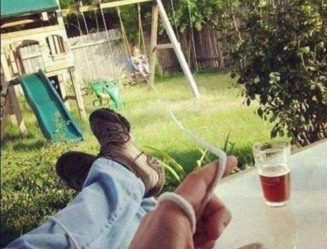 第五張:親爹帶娃,總是能給網友帶來許多笑點。這不,給女兒搖蕩秋千,這父親不需要站在后面,一根繩子搞定,動動手指就行,自己躺在椅子上悠閑地喝酒。