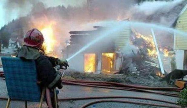 第一張:滅火這麼危急的事消防員一定是非常忙碌了。但圖片這里的消防員悠閑地坐在椅子上,舉著噴水槍在滅火,旁邊還放瓶水,像是在釣魚一樣。雖然火勢也不是很大,但是這樣真的不要緊麼?