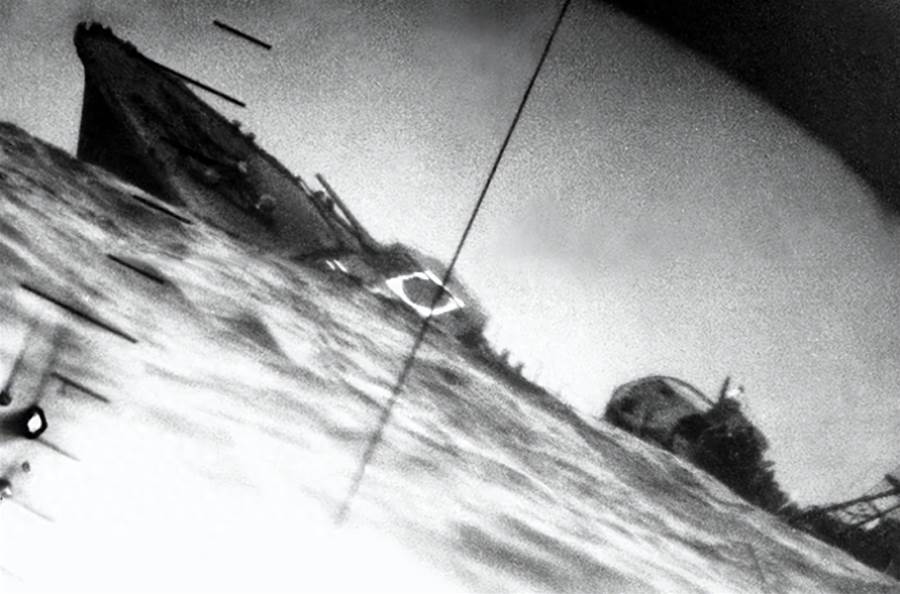 22.1942年6月,通過美軍「刺鲅」號SS-238潛水艇的潛望鏡觀察到的正在沉沒的日本軍艦。船上的膏藥也沒能堵住漏水的洞。