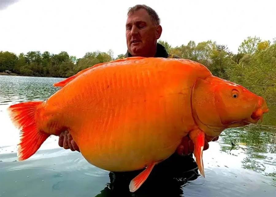 18.一名英國漁民在湖中捕到的金魚,重達67磅(60.