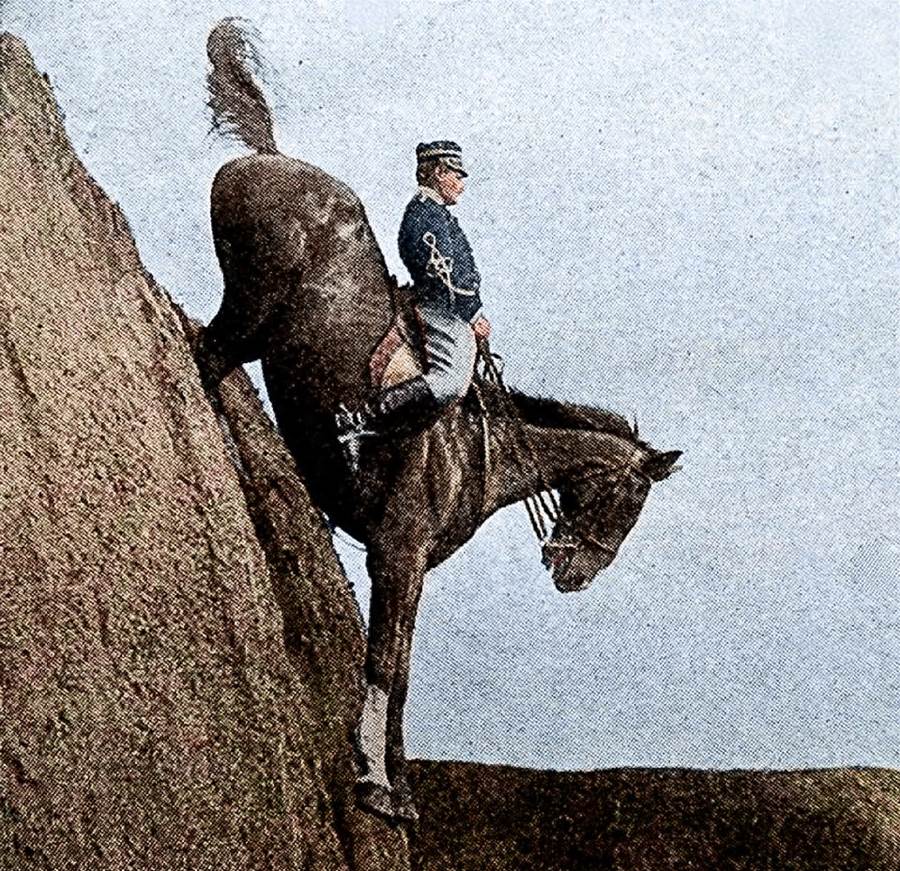 23.1906 年意大利騎兵學校的一次訓練演習中,一名軍容齊整的意大利軍官騎著馬從陡峭的高坡跳下。