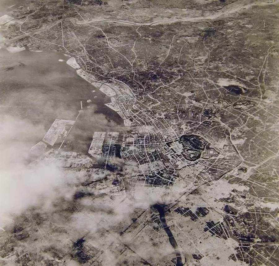 20. 1945年美國空軍對日本東京實施的大規模轟炸造成了四分之一的城市被夷為平地,超過10萬人死亡,破壞力堪比後來的原子彈轟炸,這張照片記錄了當時的災難場景。