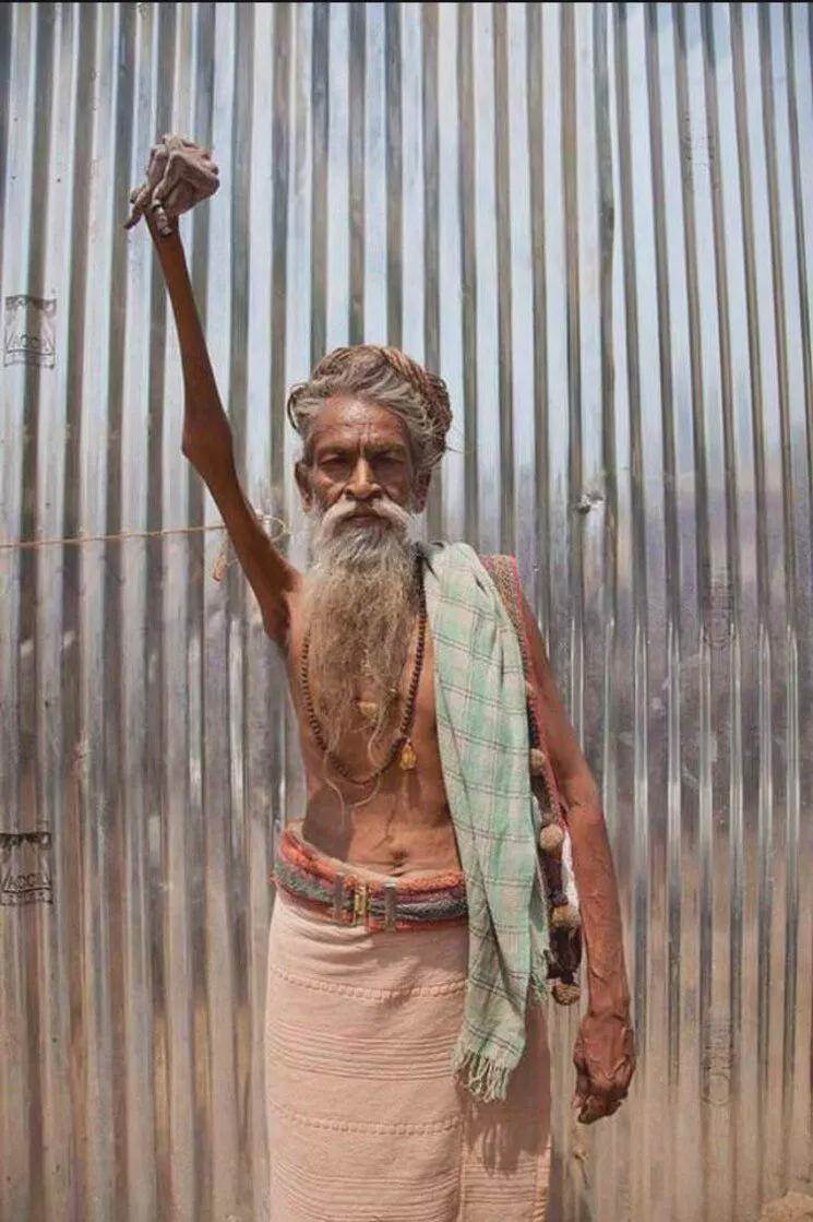 4. 印度苦行僧阿馬爾可杰從1973年開始就一直高舉右手,近50年來從未放下,表現出他對信仰的堅定和堅韌不拔的精神。