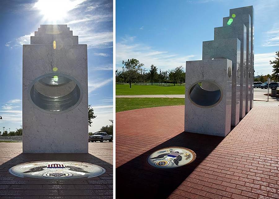 14. 退伍軍人節上午11點11分,陽光穿過五個軍種的橢圓形柱子,為國璽鑲上一道神圣的光輝。