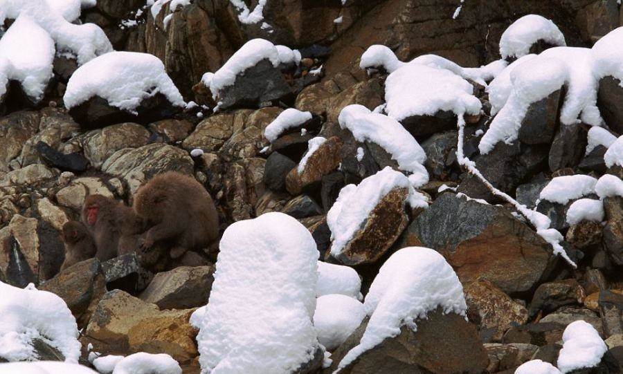 21.日本幾只藏在巖石中的獼猴。